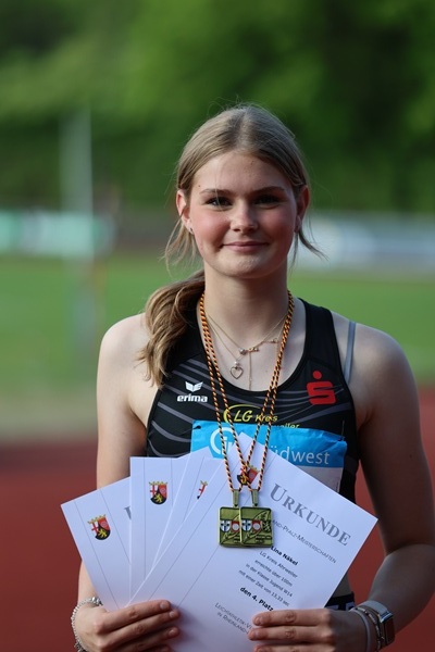 Lina Näkel (W14) ist nicht nur die amtierende Hallenmeisterin im Hochsprung und Hürdensprint, denn wie in der Halle so auch im Stadion holte sich die 14-Jährige den Titel in diesen Disziplinen und darf sich seit Sonntag auch Rheinland-Pfalz-Jugendmeisterin nennen. Beeindruckend der Hürdensprint über 80m, in welchem sie ihre am 12.05. in Meckenheim erstmals gelaufene Zeit nochmal um 3-Zehntel verbesserte (12,49 sec/pB). Im 100-m-Sprint verpasste die Dernauerin das Podium knapp (Platz 4), aber mit Blick auf das bei dieser Meisterschaft bereits absolvierte Tagesprogramm kein Grund für die Allrounderin enttäuscht zu sein. Jetzt gilt es den Fokus auf das Mehrkampfsportfest zu richten, bei welchem Lina im Juni ihren ersten Siebenkampf bestreiten wird.