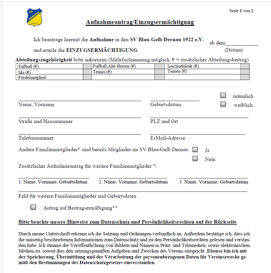 Aufnahmeantrag SV Blau-Gelb Dernau