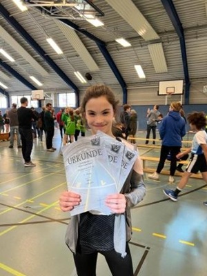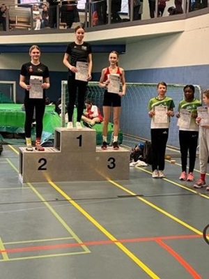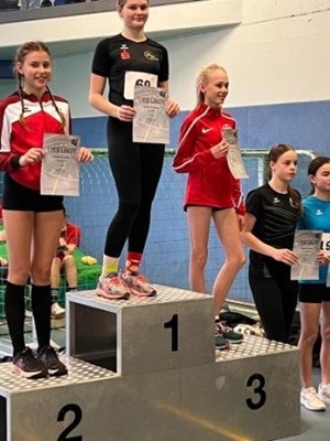 Wie Lina Näkel (W13) das letzte Jahr beendete – 5,28 m im Weitsprung – so beginnt die bald 12-Jährige das neue Jahr. Im Hochsprung sprang Lina erstmals mit 11 Jahren über die 1,5 m. Mit Platz 2 im Weitsprung und Platz 3 im Sprint komplettiert Lina ihren Medaillensatz in Troisdorf.