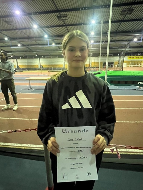 Ludwigshafen/Dernau: Die Leichtathletin Lina Näkel folgte am letzten Tag im November der Einladung von Dr. Stefan Letzelter (Leitender Landestrainer Rheinland-Pfalz) und Alexander Gakstädter (Landestrainer Sprung) zum Talent-Mehrsprung-Cup Landesentscheid Rheinland-Pfalz in Ludwigshafen am Rhein.
