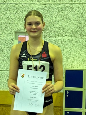 3x Silber und 1x Bronze war die Ausbeute von Lina Näkel (W15). Mit Platz zwei und der Vizemeisterschaft im Hochsprung startete Lina richtig gut in den langen Wettkampftag. Es folgte der Hürdensprint und es passierte, womit keiner gerechnet hatte: Lina schied aus. Deutlich in Führung liegend touchierte sie die dritte Hürde, kam aus dem Tritt und konnte den Sprint nicht beenden. Die Enttäuschung war dementsprechend groß, war es doch die sicher geglaubte Titelchance. Aufstecken und den Kopf hängen lassen ist nicht ihre Art und so zeigte sie im Kugelstoßen und 60-m-Sprint ihr großes Kämpferherz. Zumal es zwei Disziplinen sind, in welchen Lina nicht mit einer Medaille rechnete. Umso bemerkenswerter das Kugelstoßen der 13-Jährigen: Mit neuer pB und 10,79m holte Lina die Vizemeisterschaft. Auch über die 60m lief die Dernauerin so schnell wie nie zuvor und holte Bronze.