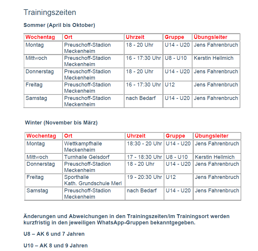 Trainingszeiten